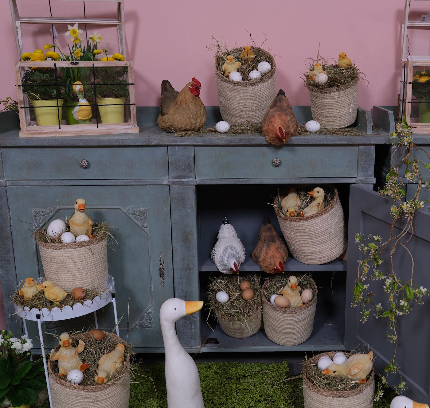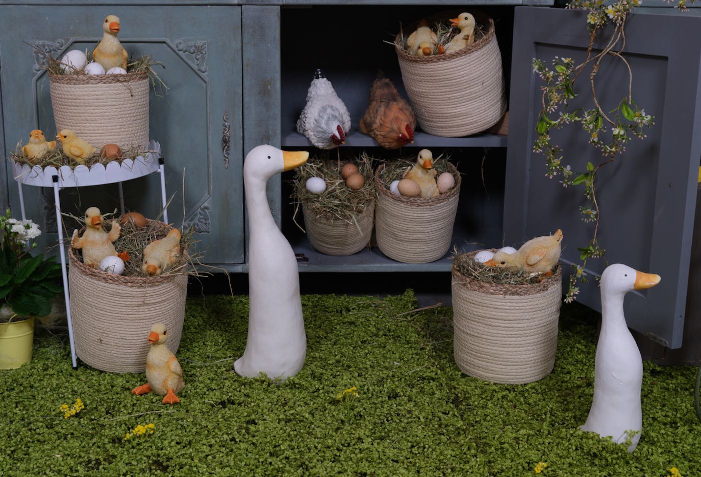 Die Hühner und Gänseeier sind unterschiedlich, teilweise aus echten Eiern und teilweise aus Styropor- bzw Plastik Eier hergestellt. Die großen Aufhänger für Gänseeier und die kleinen Aufhänger für die Hühnereier.