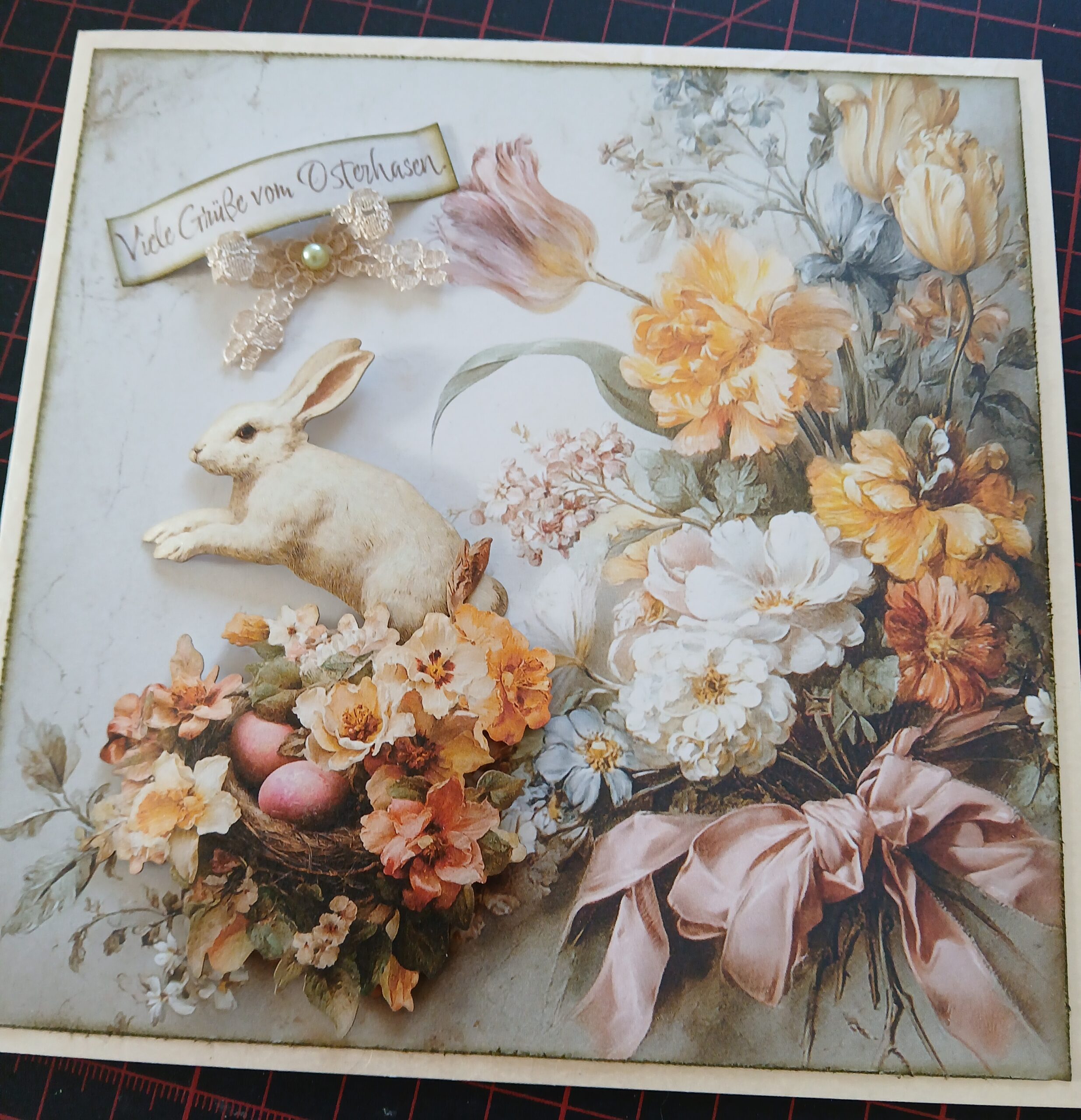 Styroporei ausgeschnitten. Im Inneren mit LB Mould Anhänger, Transfers, Hortensien in Gold (einzelne Blüten abgeschnitten) und Krakeliertechnik innen und außen.