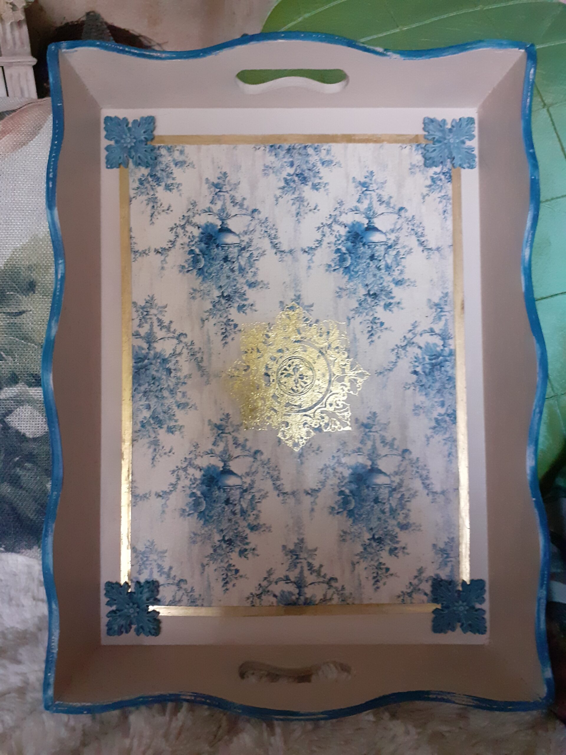 Diesmal sollte es auffällig sein🙂Das Motiv habe ich auf eine MDF Platte übertragen und den Rahmen mit flexiblen Bordüren und Ornamente aus Resin gesetzt.Mit einem Konturenstift auf dem Motiv noch Akzente gesetzt.Zur Verzierung habe ich Halbperlen,Strass und Mittelpunkte eingesetzt.Alles auf einer größeren Platte aufgebracht die ich vorher mit der Acrylfarbe „Rotwein“ und Klarlack bemalt habe.Metallecken und Bänder für die Umrandung.