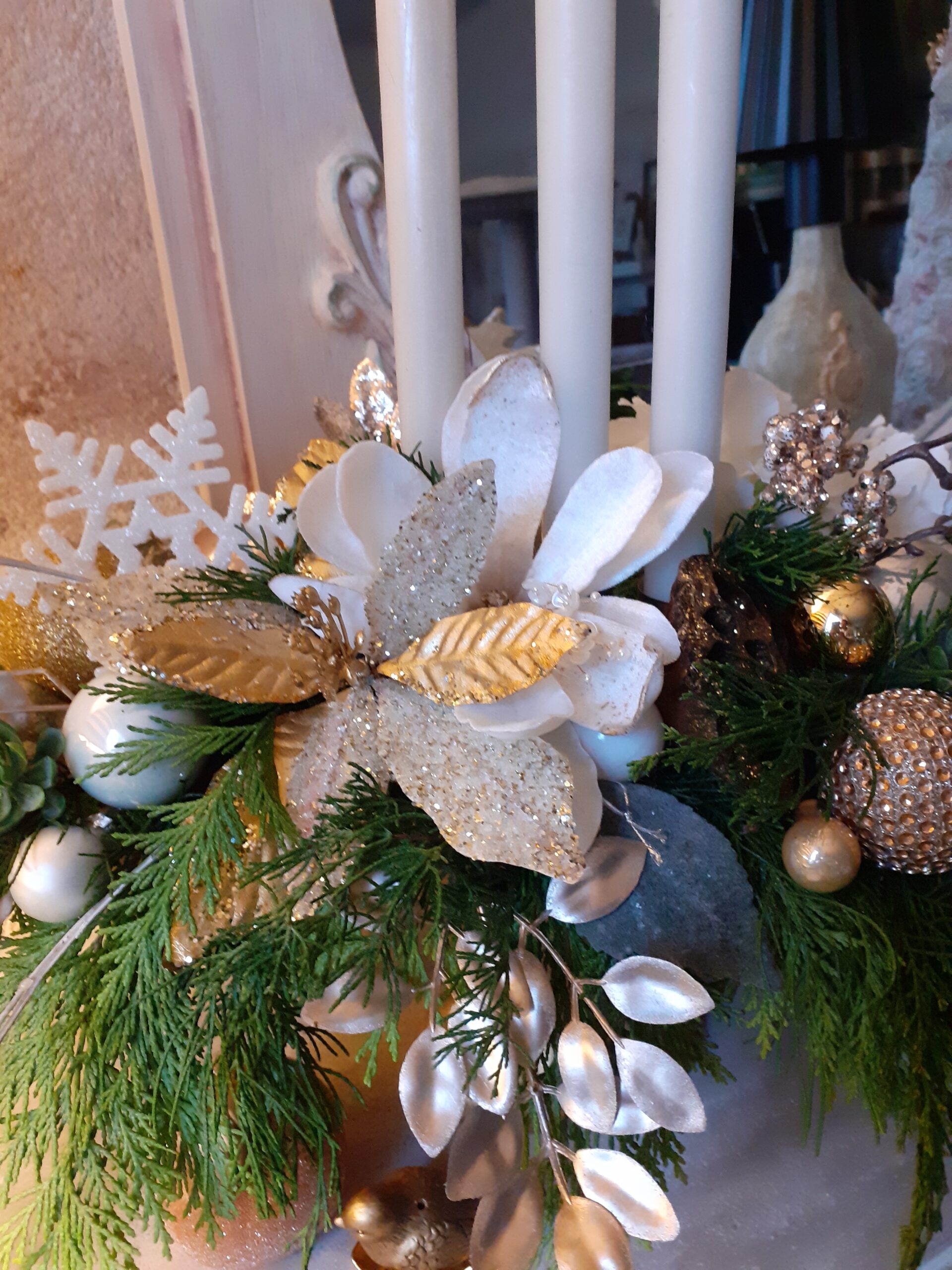 Hier wurden Dunkelbraun für den Rahmen, desweiteten Dunkelbraun mit Gelber Sand für die Umrandung gemischt, um einen Nougatton zu erhalten. Mit einer Schablone von Blanche und Heavy Body Gel Braun Muster auf bringen. Danach einige Stellen mit Rub on Pigment Brass auftragen. Auf das Bild Crackle Clsssic streichen. Mit wenige Antik Paste nur um den Rand gehen. Transfers, Engel und die Bordüre aufkleben. Diese Teile wurden mit Cremeweiß und Antikgel Ocker gestrichen.