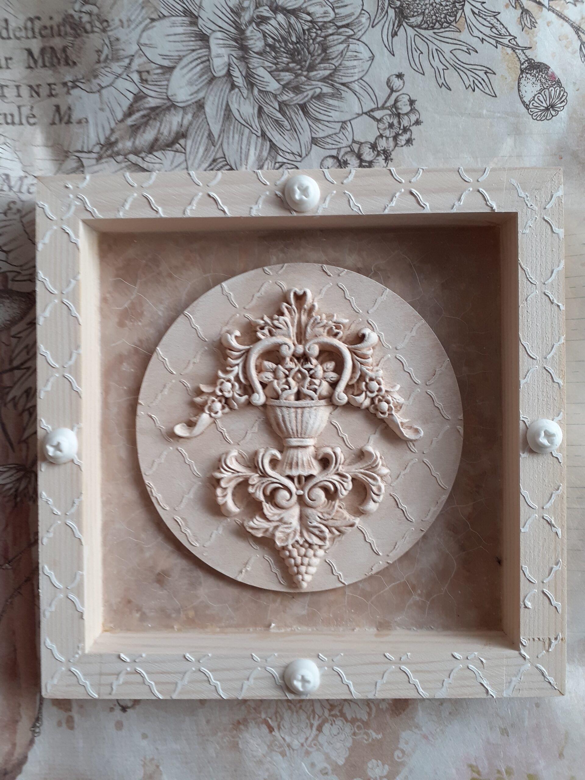 Habe das schöne Decoupagepapier vom vergangenen Jahr und die Wassertransfers zusammen verarbeitet, weil sie farblich so schön miteinander harmonieren. Die Blüten und Engel sind aus Hearty, farblich geschaltet und teilweise mit Pigmentefix und Goldpigment bearbeitet worden. Die Wasser transfers sind mir auch krackeliert.Ich hatte zuvor den Untergrund mit Mattlack gestrichen. Vielleicht war das der Grund. Es passt aber gut dazu.