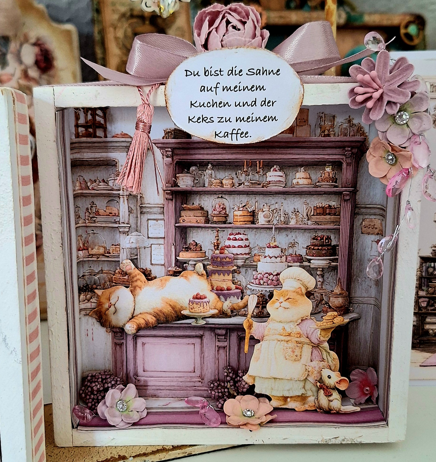 Hier habe ich wiederum mit Cremeweiß und Lasurgel Umbra sowie mit Hearty gearbeitet. Hatte noch ein paar hübsche grüne Stoffblätter, die hier ganz gut dazu passen.