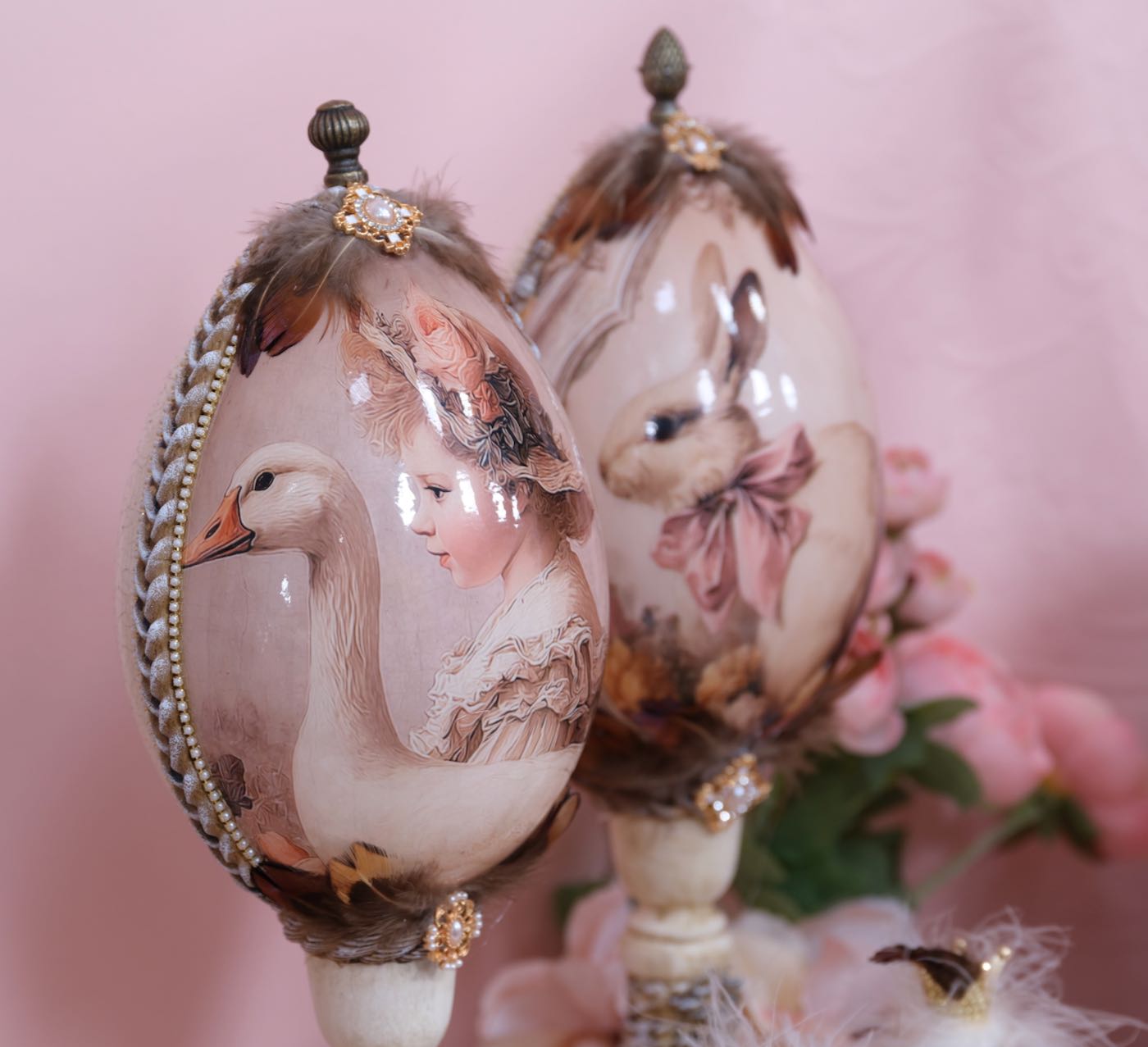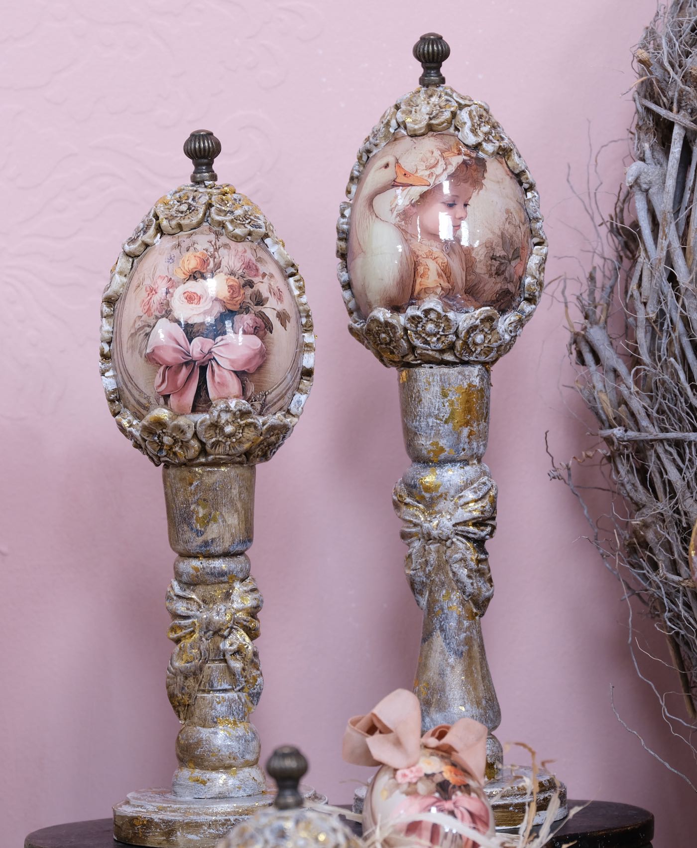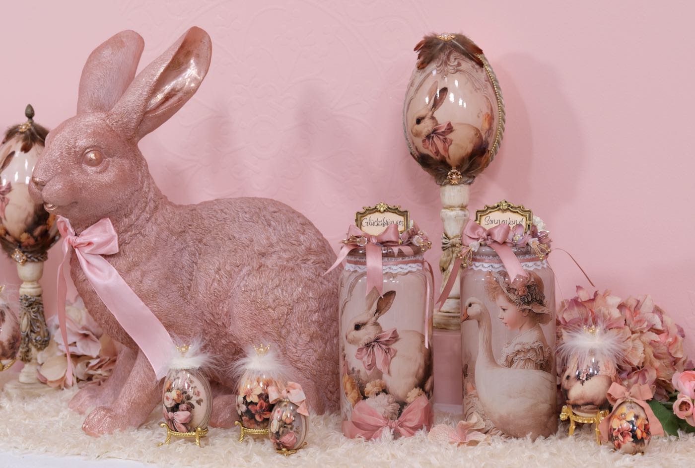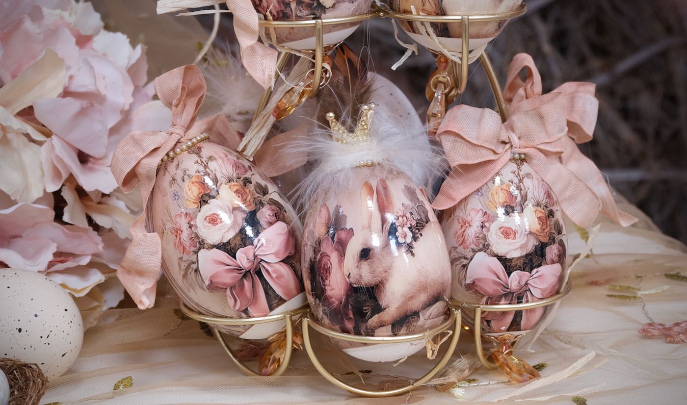 Die Hühner und Gänseeier sind unterschiedlich, teilweise aus echten Eiern und teilweise aus Styropor- bzw Plastik Eier hergestellt. Die großen Aufhänger für Gänseeier und die kleinen Aufhänger für die Hühnereier.
