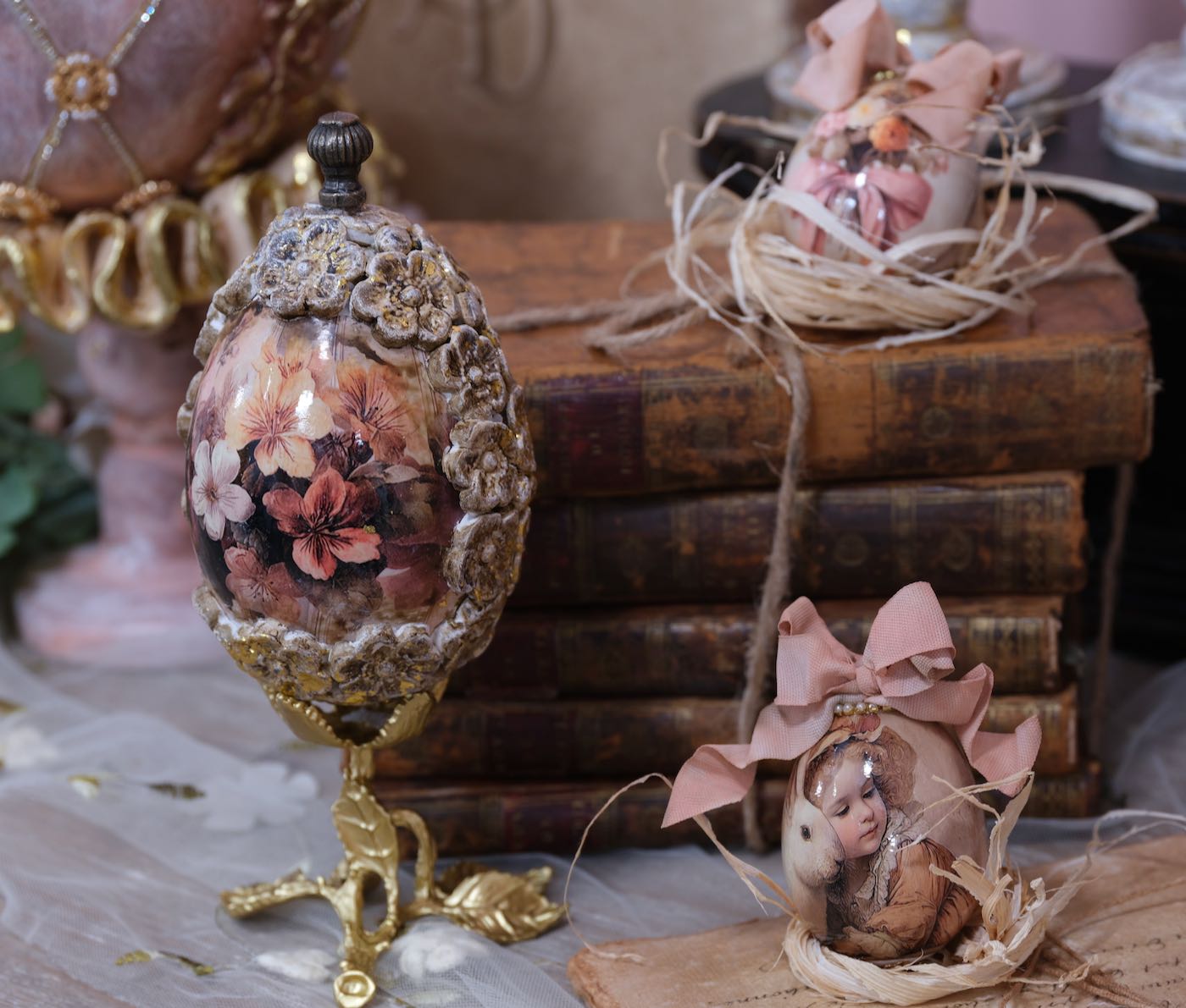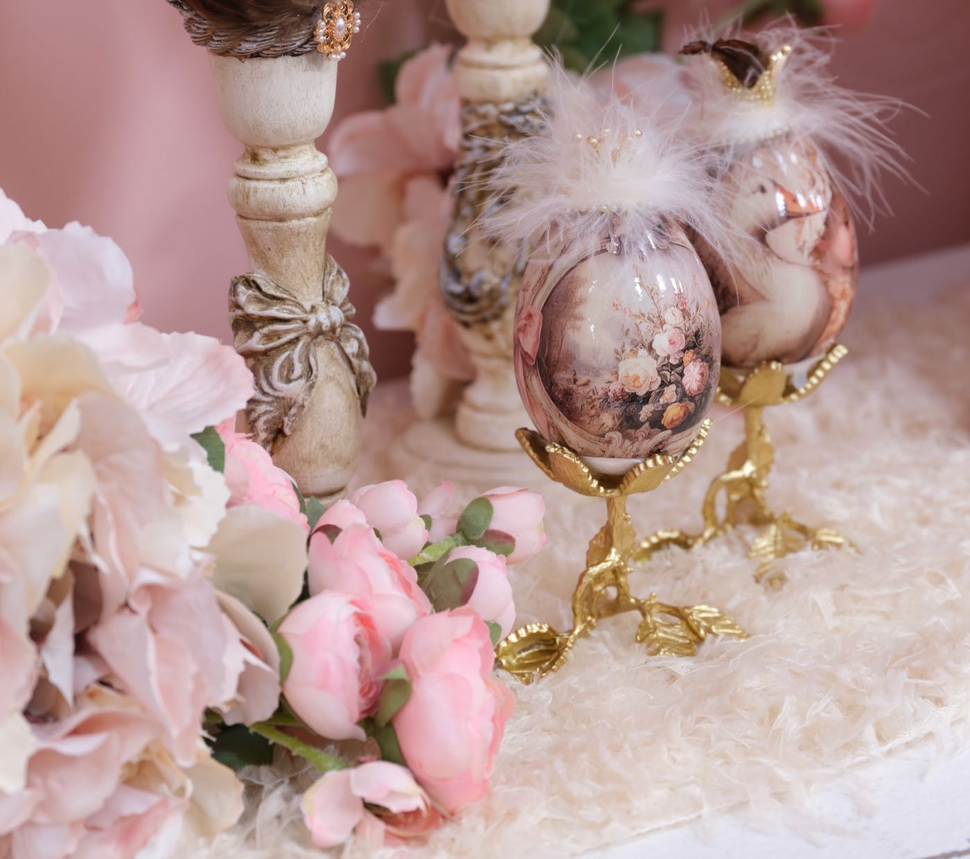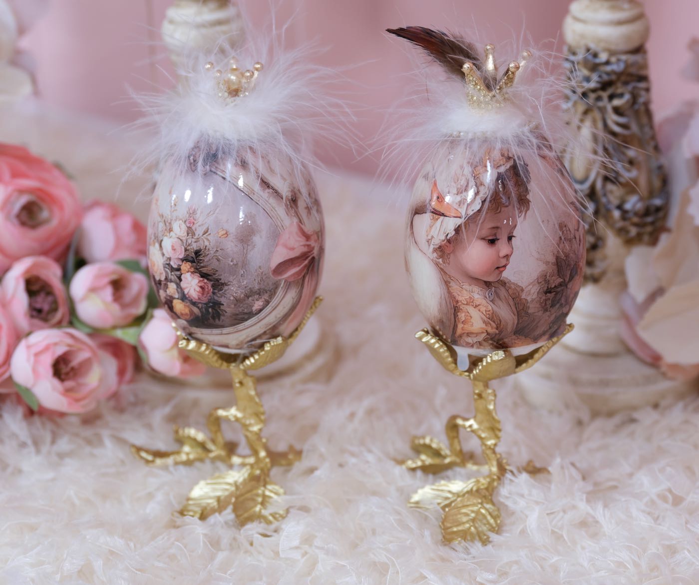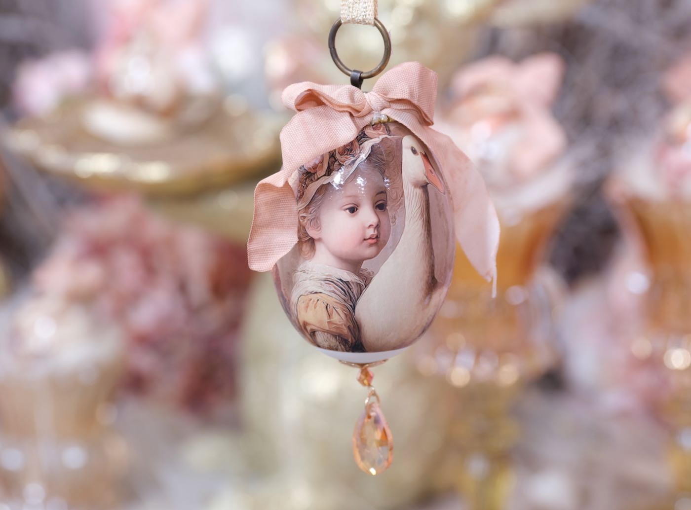 Die Hühner und Gänseeier sind unterschiedlich, teilweise aus echten Eiern und teilweise aus Styropor- bzw Plastik Eier hergestellt. Die großen Aufhänger für Gänseeier und die kleinen Aufhänger für die Hühnereier.