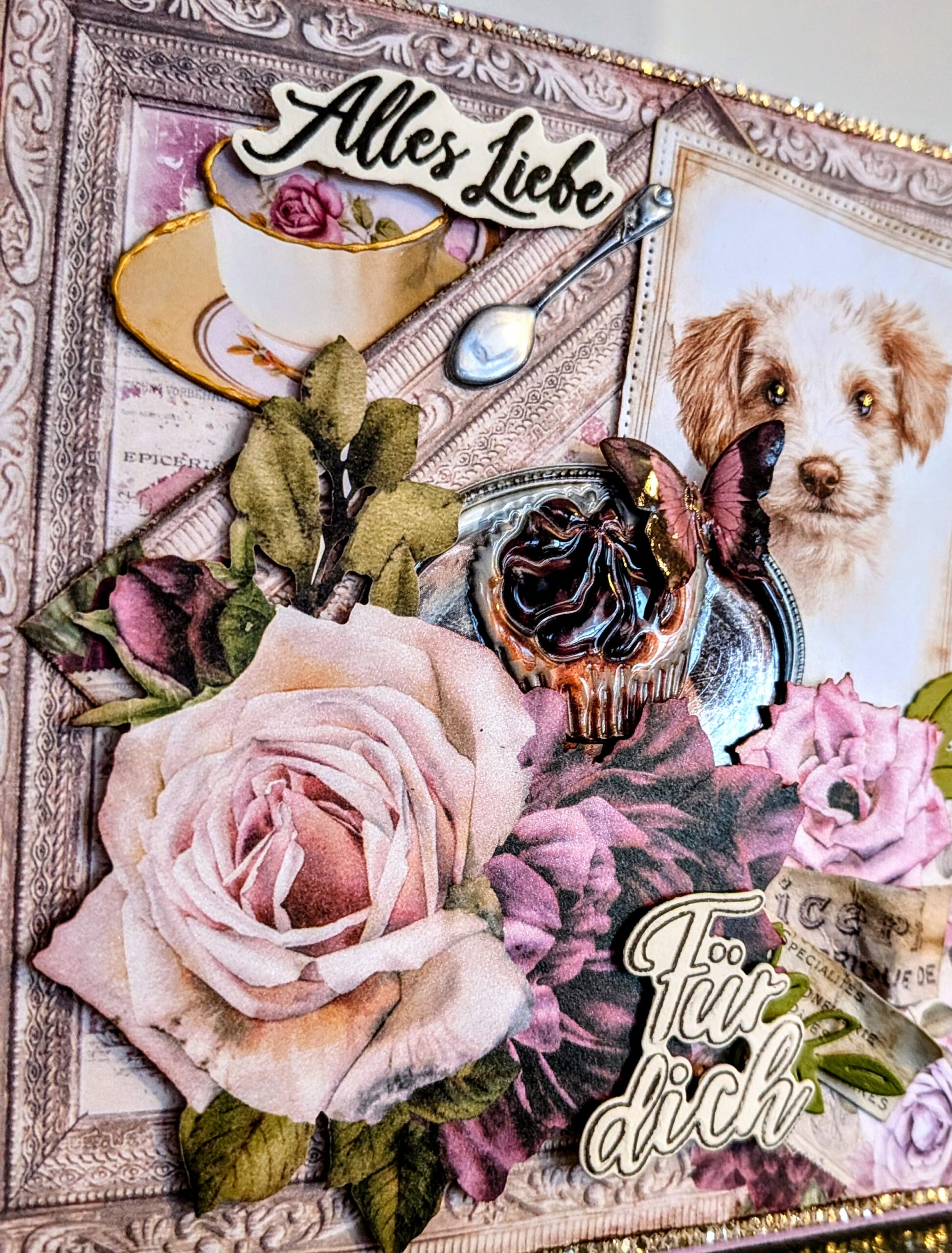 Der Rahmen wurde mit Resinblumen verziert, das Bild krakeliert und transparentes Resin für die Flügel