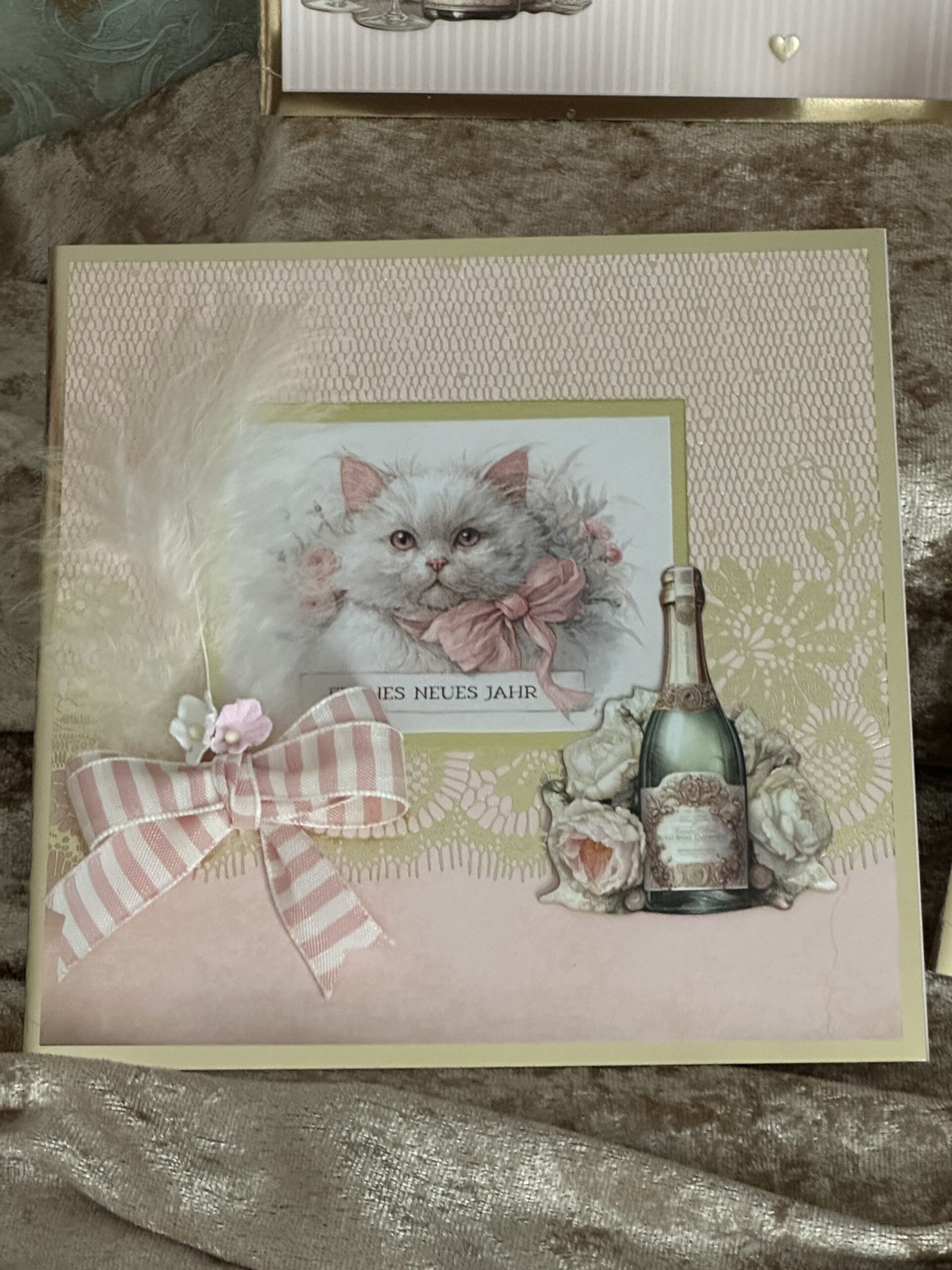 Pappschachtel innen mit Samtpuder. Schrift mit Goldstift von Blanche. Schablonentechnik.